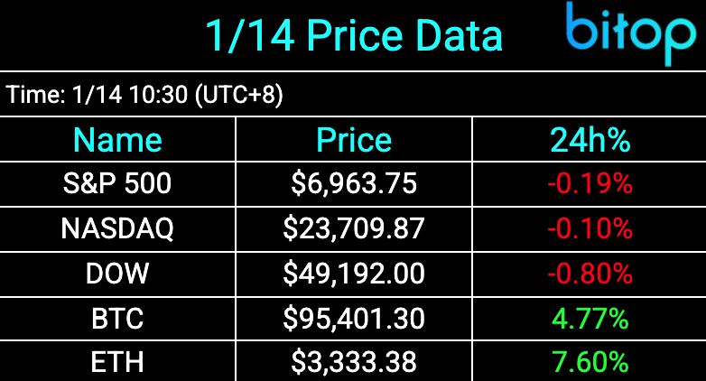 JPMorgan's weak stock performance dragged down bank shares, causing the three major U.S. stock indices to retreat from their highs. Cryptocurrencies surged strongly, with the overall market cap rising over 5% in the past 24 hours. Bitcoin briefly climbed to $96,495 this morning, while Ethereum reclaimed above $3,300. Indicators in the derivatives market are gradually warming up, potentially triggering an accelerated rally after a breakthrough.